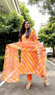 Celebrate the beauty of fluid tradition with Tarakini, a captivating Leheria-printed suit set that dances with every step. Featuring wave-like patterns and subtle mirror embroidery on the yoke, this dress brings a fresh and flowy silhouette. The light cotton lining ensures breathable comfort, while the playful dupatta with matching Leheria stripes completes the coordinated look. Ideal for day events, haldi functions, or summer festivities, it is the perfect blend of simplicity and vibrance.