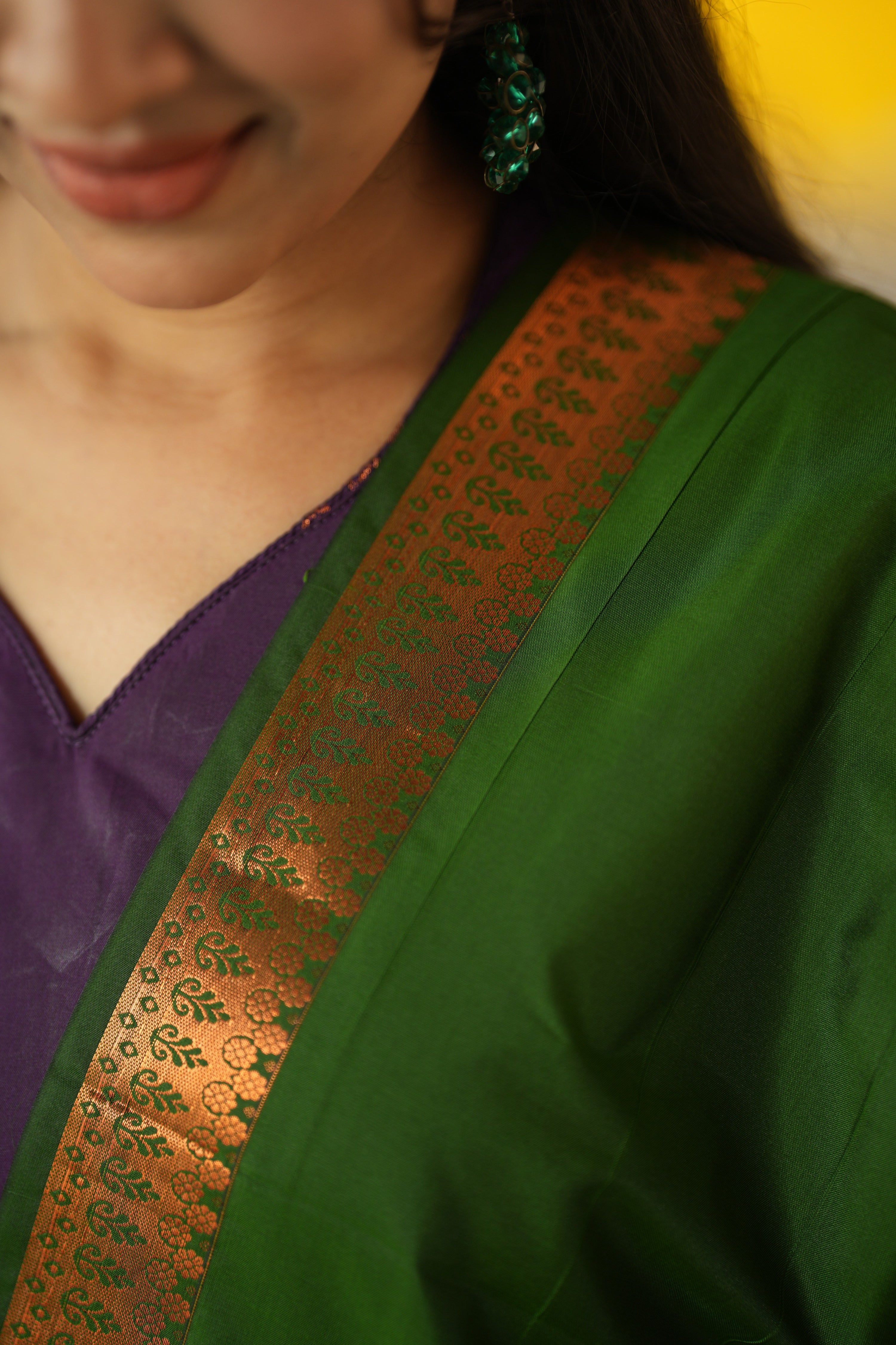 Drape yourself in regal charm with this Pochampally-inspired three-piece suit set that speaks volumes of elegance and heritage! The deep purple kurta adorned with traditional copper zari motifs is paired with a lush green dupatta featuring rich woven borders and a contrast pallu. The bordered sleeves and neckline detailing enhance the festive finesse, making it a perfect pick for celebrations or graceful daywear. ๐