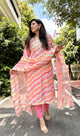 Celebrate the beauty of fluid tradition with Tarakini, a captivating Leheria-printed suit set that dances with every step. Featuring wave-like patterns and subtle mirror embroidery on the yoke, this dress brings a fresh and flowy silhouette. The light cotton lining ensures breathable comfort, while the playful dupatta with matching Leheria stripes completes the coordinated look. Ideal for day events, haldi functions, or summer festivities, it is the perfect blend of simplicity and vibrance.