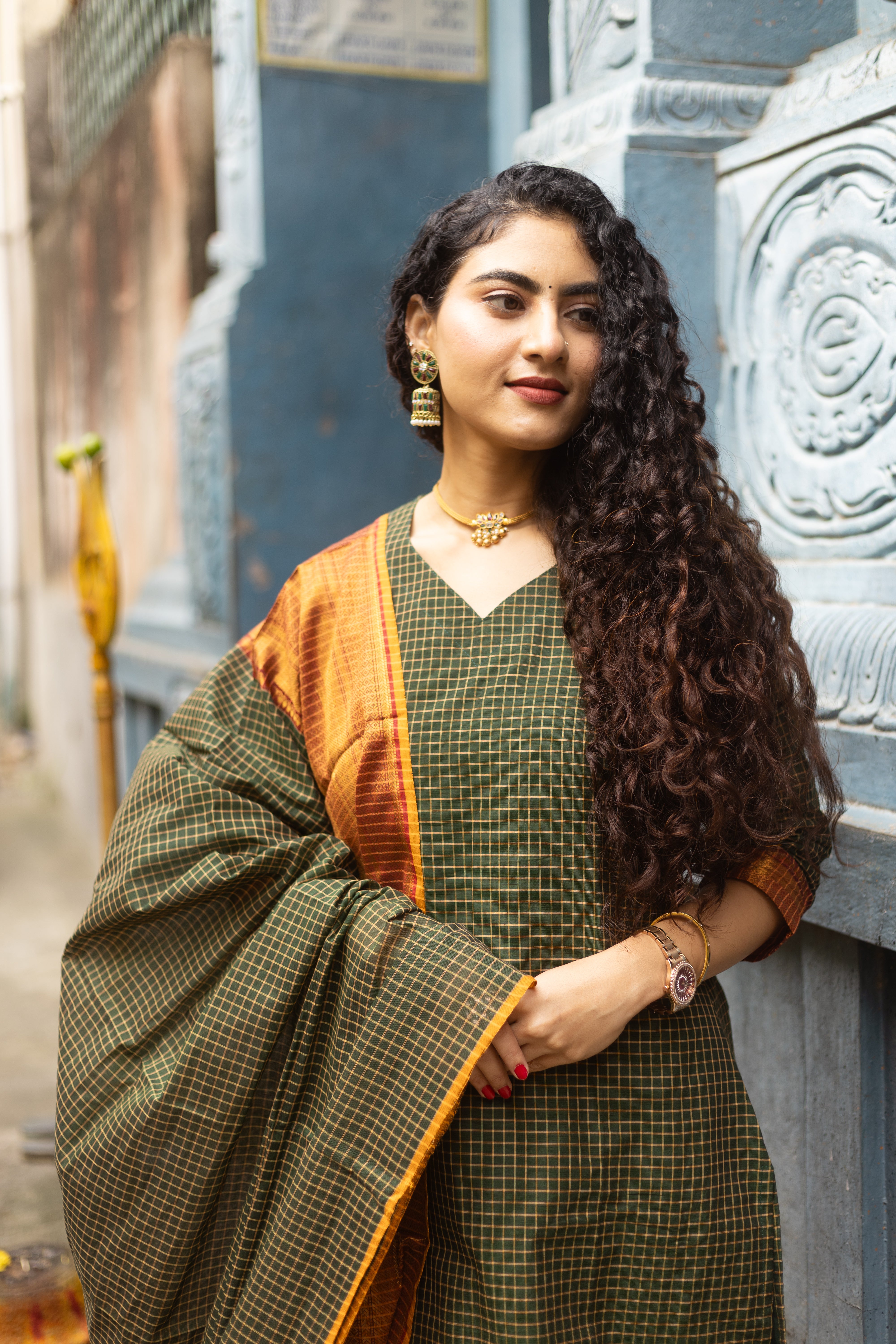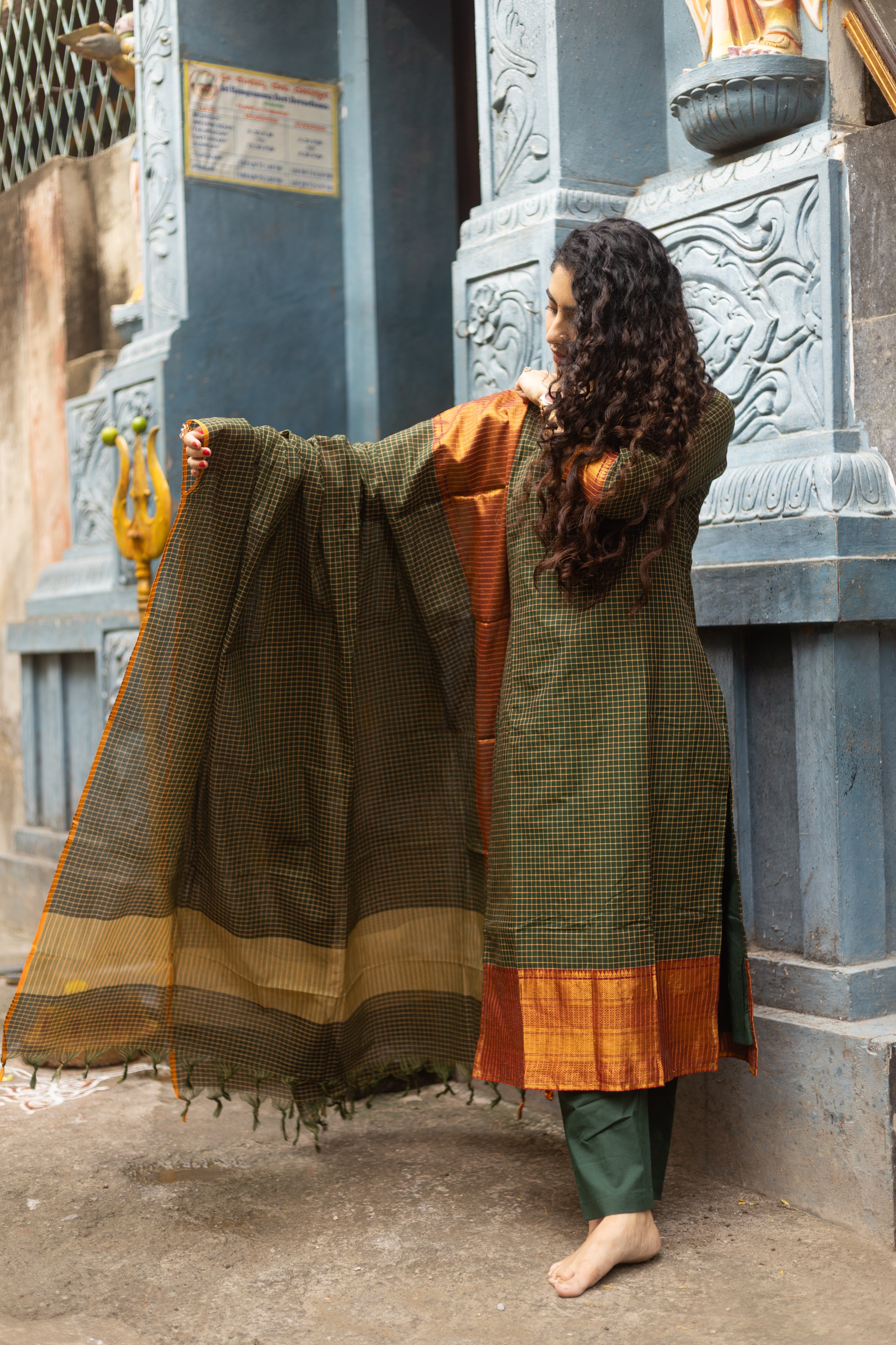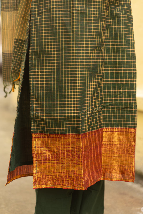 A timeless blend of South Indian heritage and earthy elegance, this rust-orange and olive green checkered cotton suit with rich pallu dupatta is made to make heads turn—subtle, classic, and rooted in tradition 🌿✨