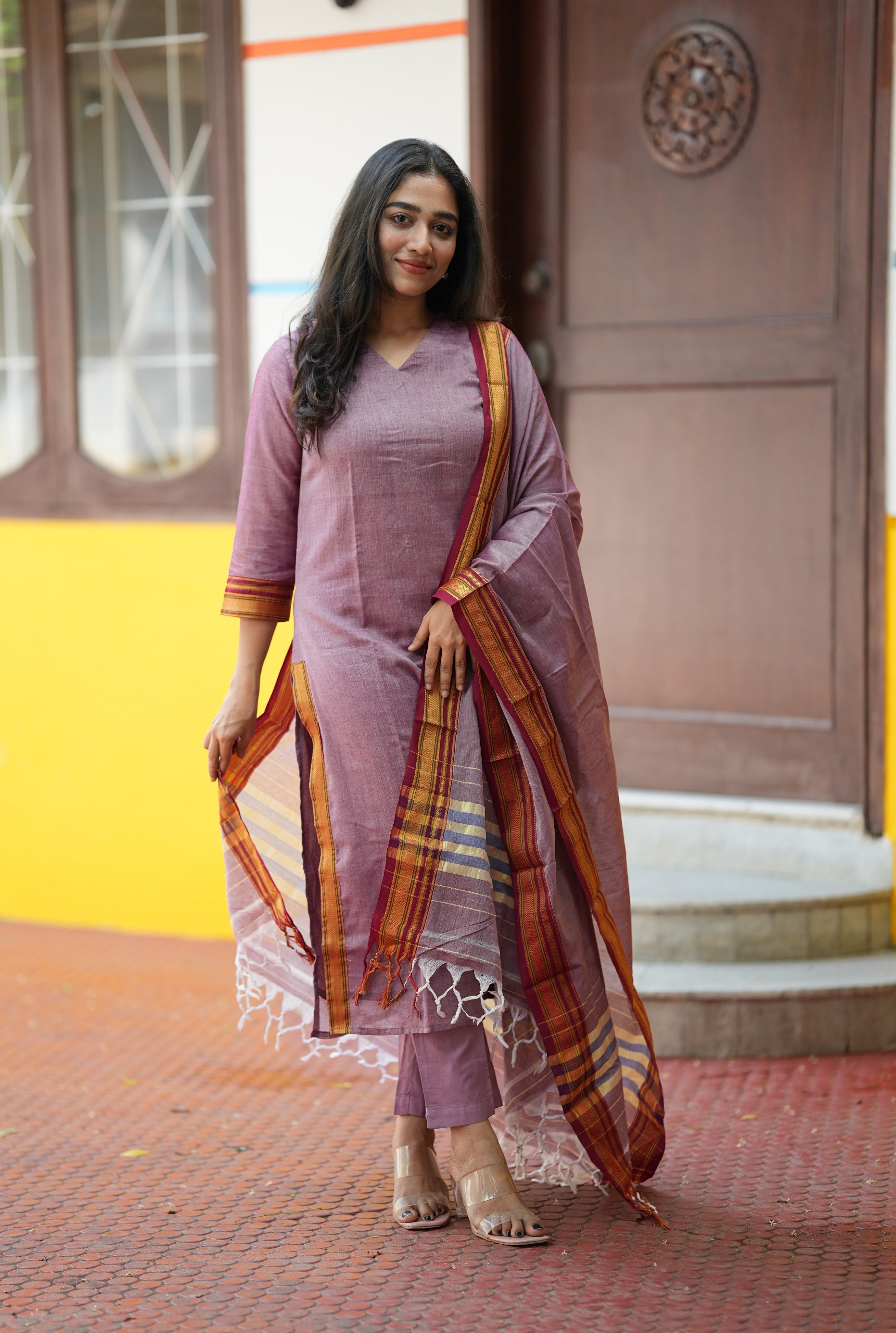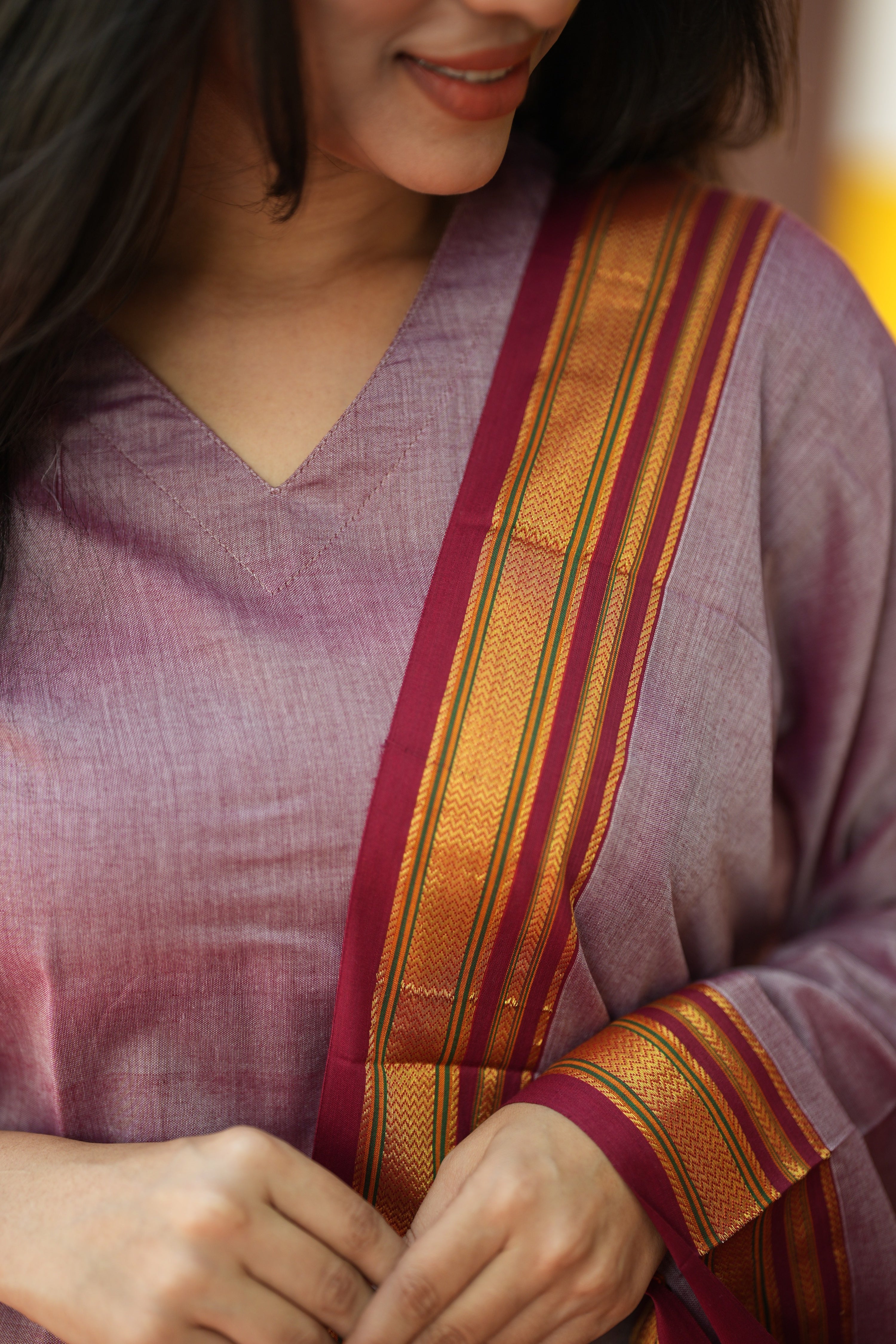 A subtle yet regal Narayanpet cotton suit set in a dusty lilac shade, adorned with traditional temple borders and vibrant woven stripes on the dupatta – perfect for heritage lovers who adore understated elegance!