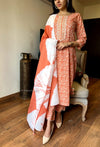 This black cotton handloom kurta is a masterpiece of simplicity and sophistication. The soft, breathable cotton ensures comfort, while the flowing silhouette flatters all body types. Paired with an elegant maroon Chanderi dupatta embellished with intricate motifs, this outfit perfectly combines timeless charm with a contemporary touch. The finely crafted detailing on the dupatta adds a touch of luxury, making it ideal for festive gatherings, casual outings, or intimate celebrations.