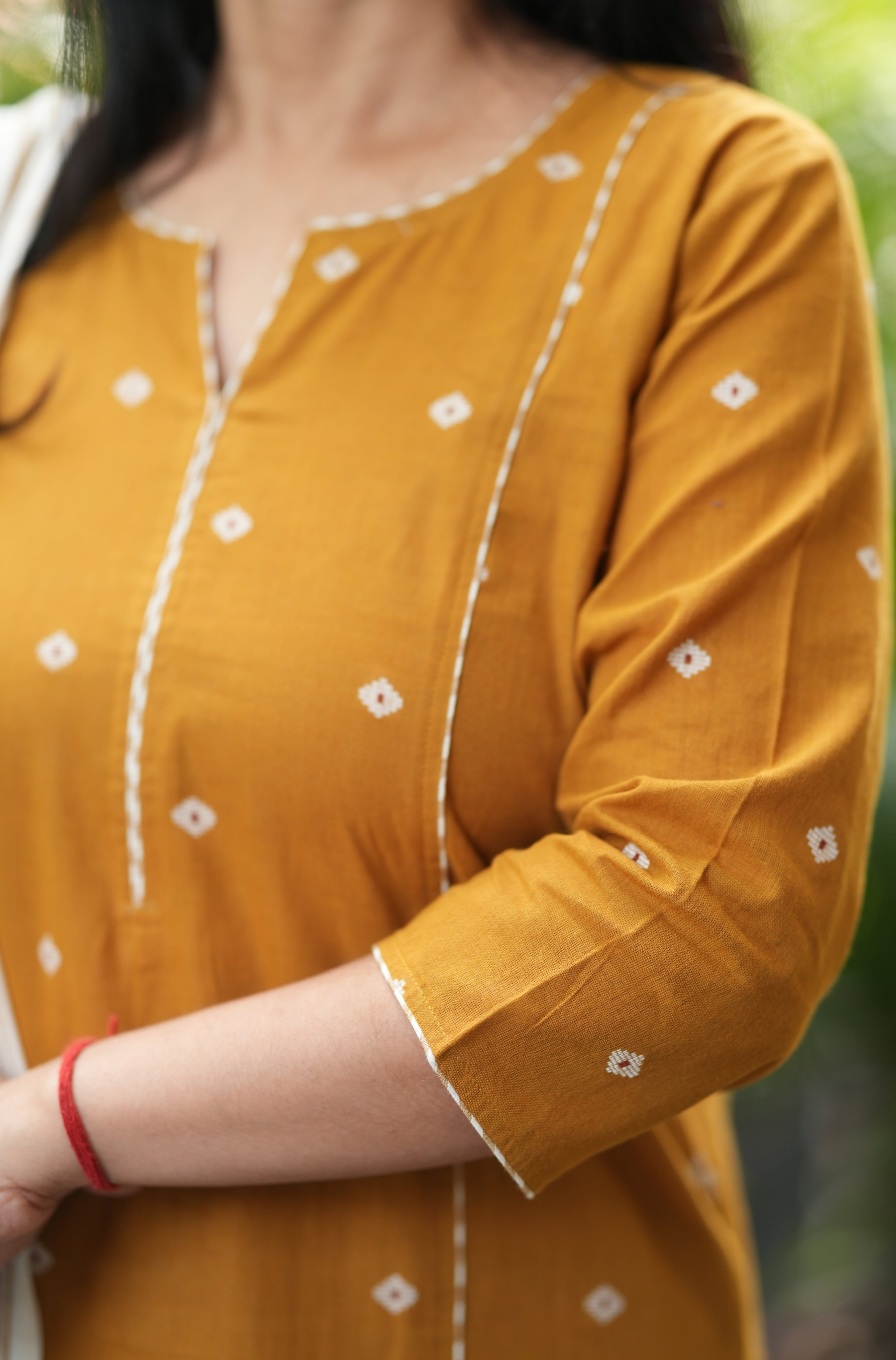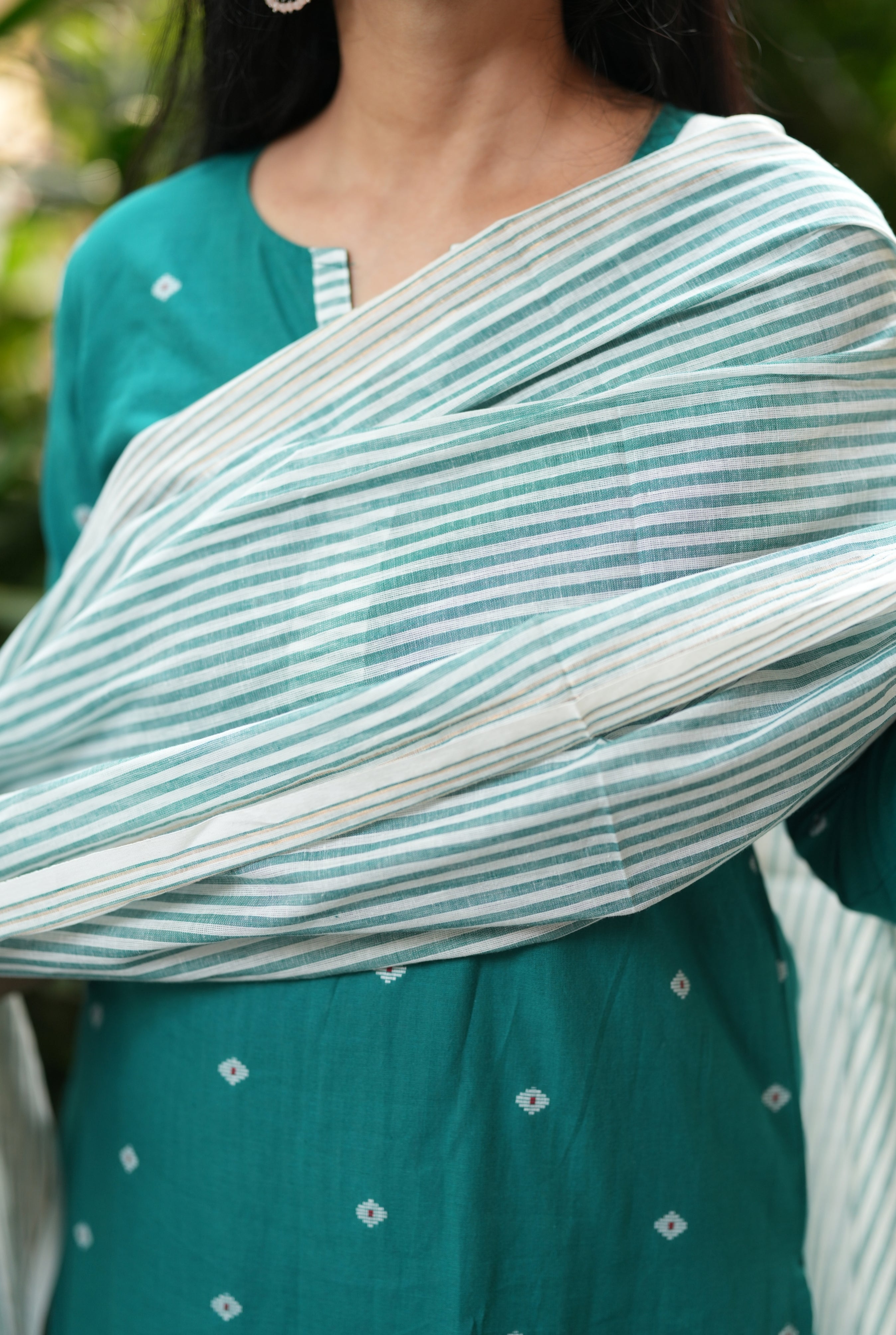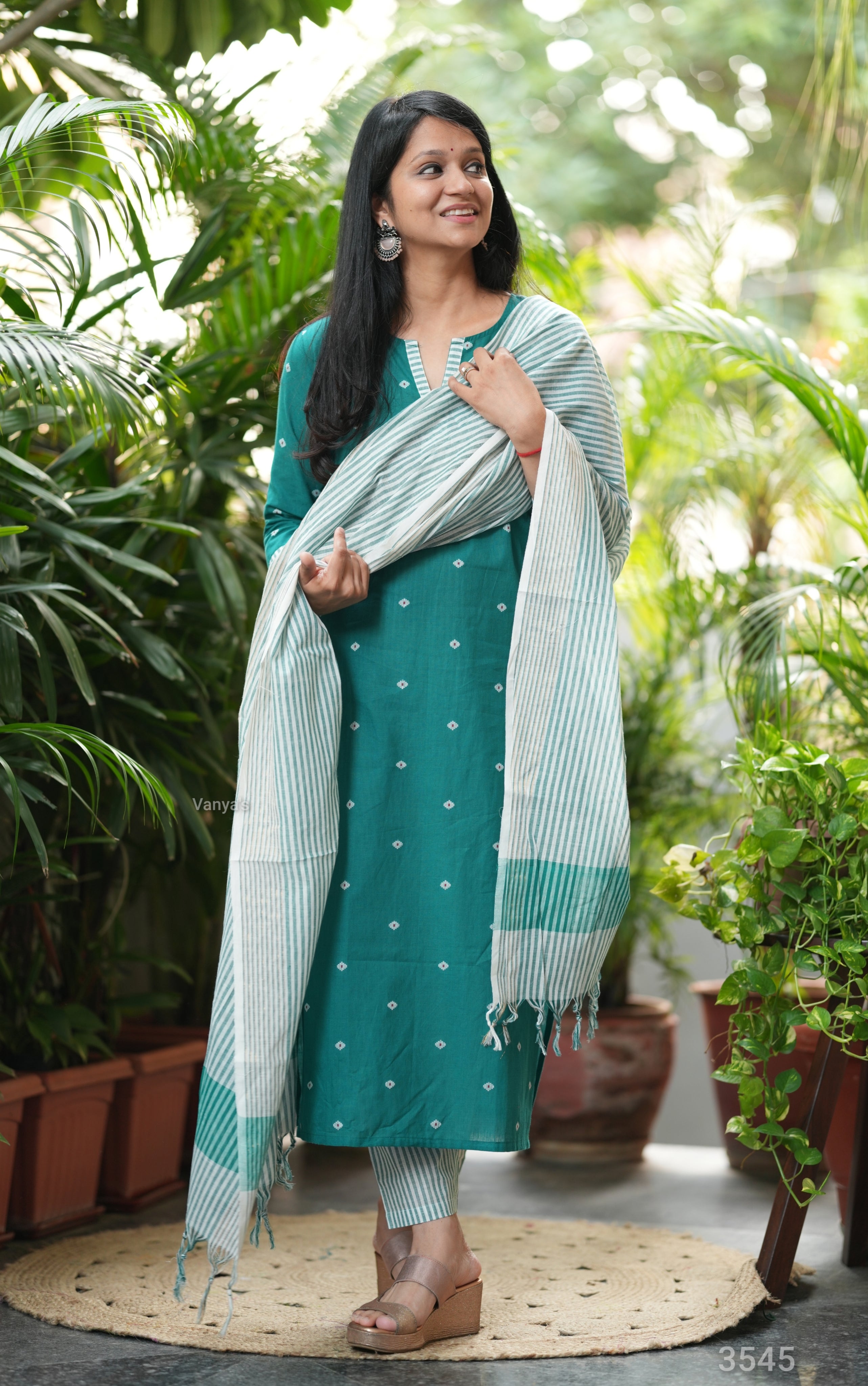 This charming South cotton suit set offers a harmonious blend of comfort and tradition. Featuring a straight-cut kurta adorned with delicate handwoven motifs, it is paired with a solid pant and a soft, flowing dupatta that completes the ensemble. The fabric's natural breathability and lightweight texture make it ideal for all-day wear, while its subtle pattern and fine finish elevate your everyday ethnic wardrobe. Whether for work or casual outings, this set promises a refined and graceful appearance.