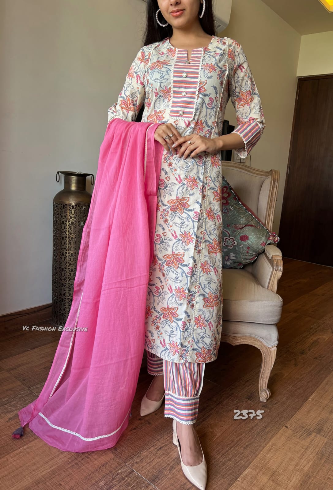 A fresh floral celebration in cotton! πΈ Soft hues, striped detailing, and a cheerful pink dupatta make this kurta set a perfect pick for work, brunches, or a breezy day out.