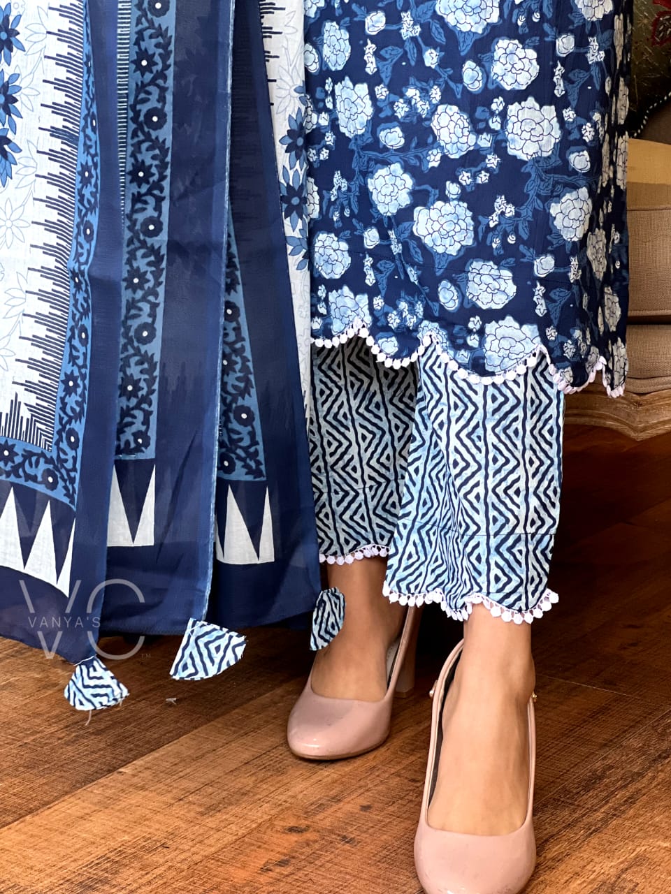 A charming blend of tradition and trend, this indigo cotton suit set features elegant white floral prints, scalloped neckline, and a striking printed dupatta that adds a bold flair to your ethnic ensemble. πΏ