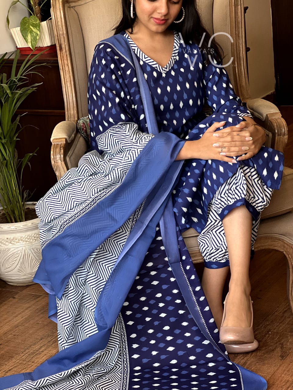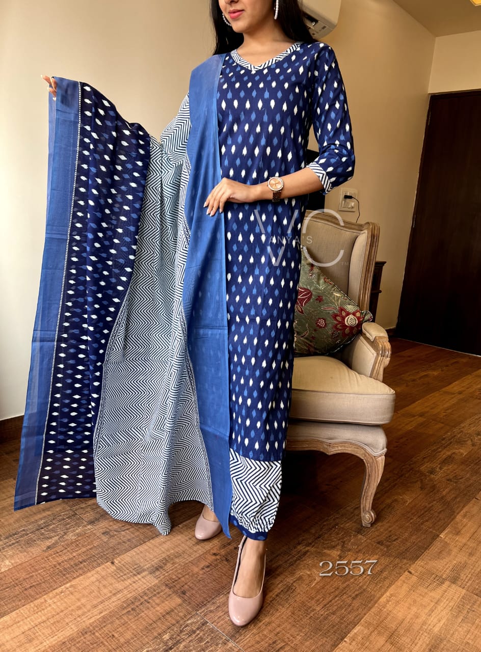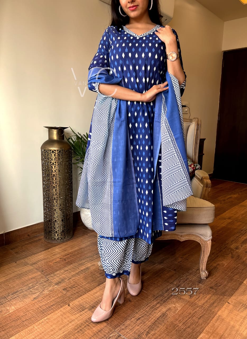 Fall in love with this timeless indigo Ikat Printed Kurta Set, crafted in pure breathable cotton. The kurta features elegant ikat motifs in classic white over a deep blue base, complemented with a flattering flared cut for that easy, breezy feel. The set is perfectly paired with a chevron block-printed dupatta and contrast drawstring ankle pants, making it a go-to ensemble for casual outings and festive gatherings. This is your ultimate ethnic chic moment, where comfort meets eye-catching style! π«π£