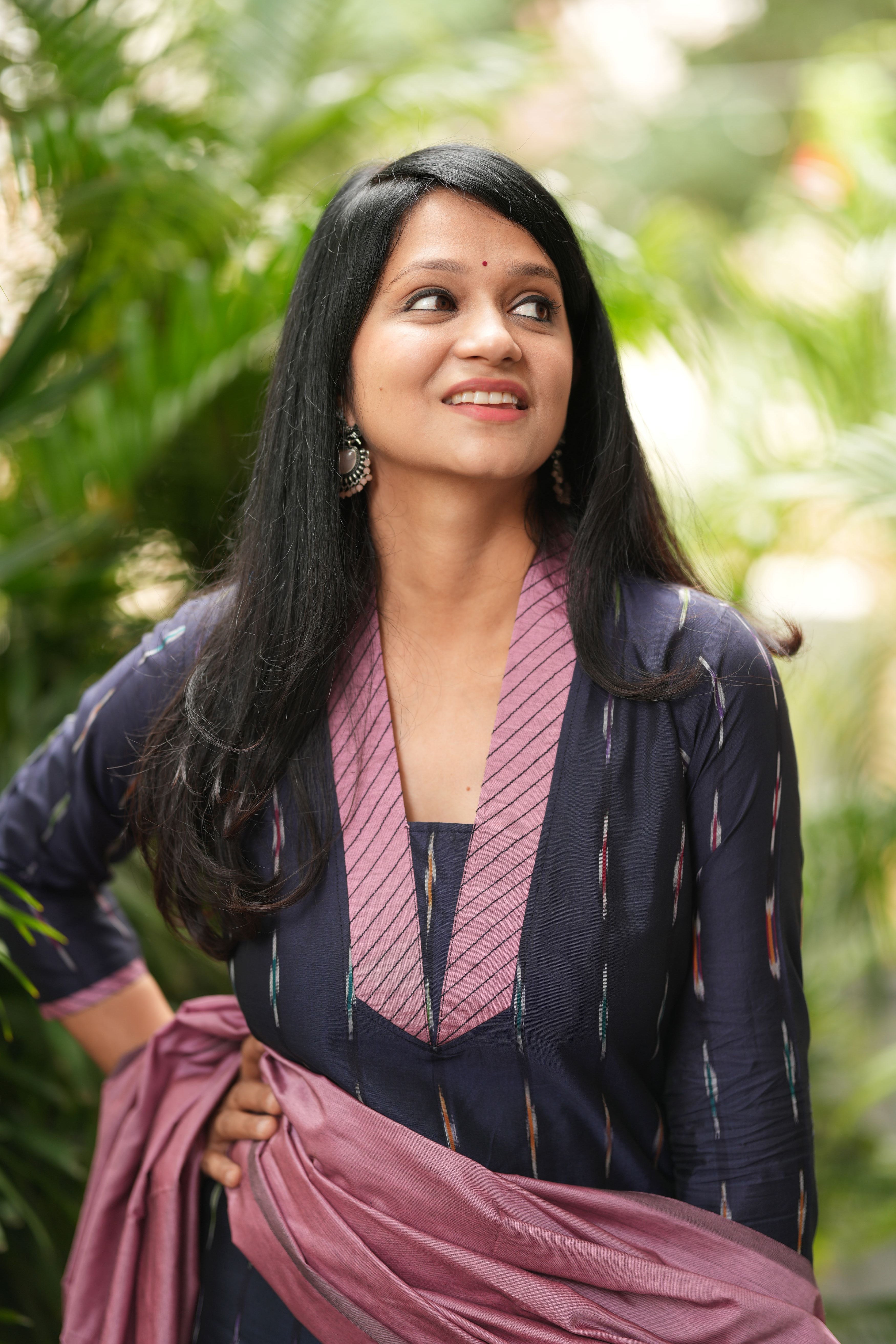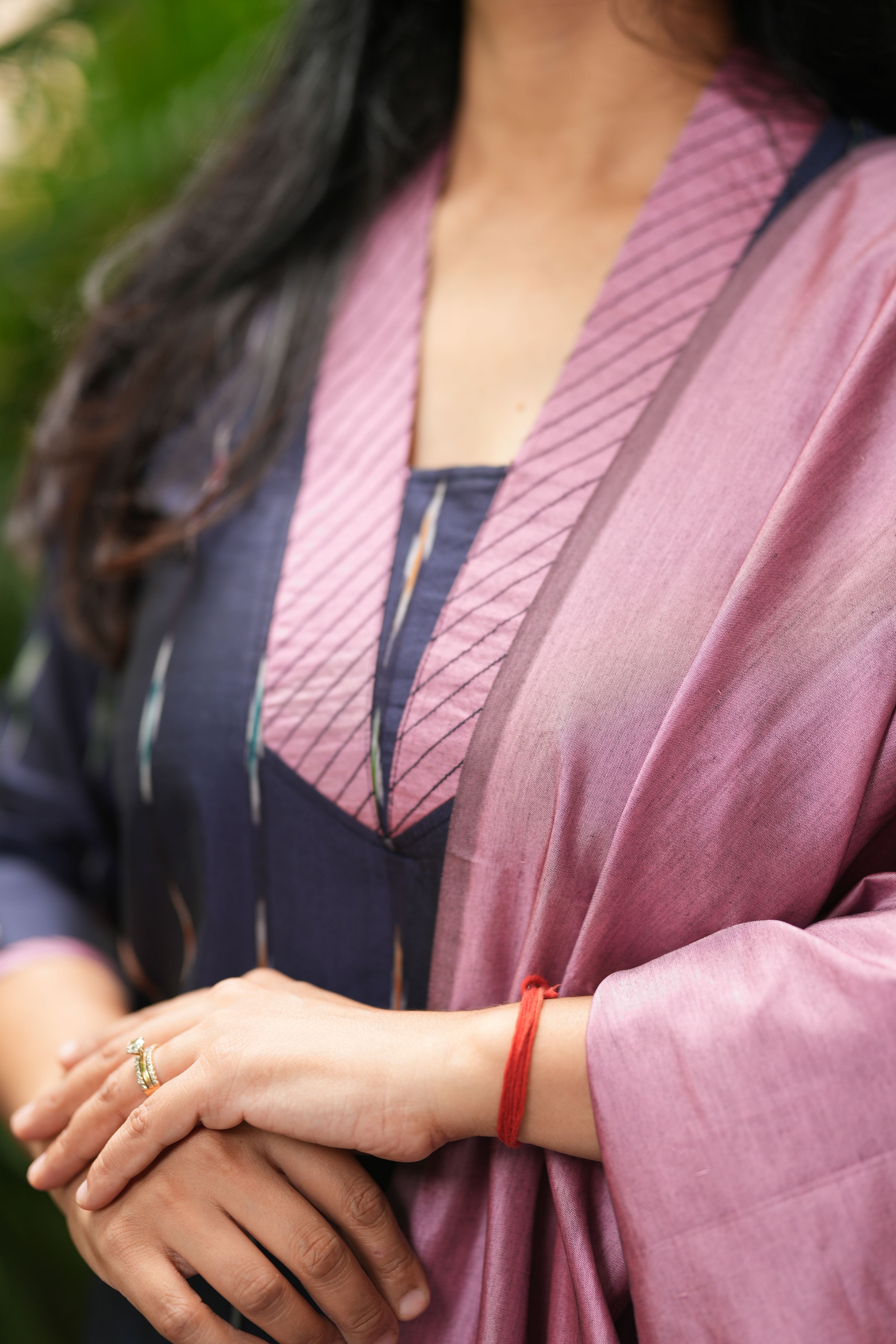 Unveil timeless sophistication with Lavya , a gorgeous Pochampally silk suit set crafted for women who admire subtle luxury. The black ikat-woven kurta is highlighted with a blush-pink contrast pant and a dual-tone dupatta in pink and black, finished with traditional woven borders. Its graceful silhouette and premium fabric make it the perfect outfit for Diwali, poojas, weddings, or ethnic soirées.