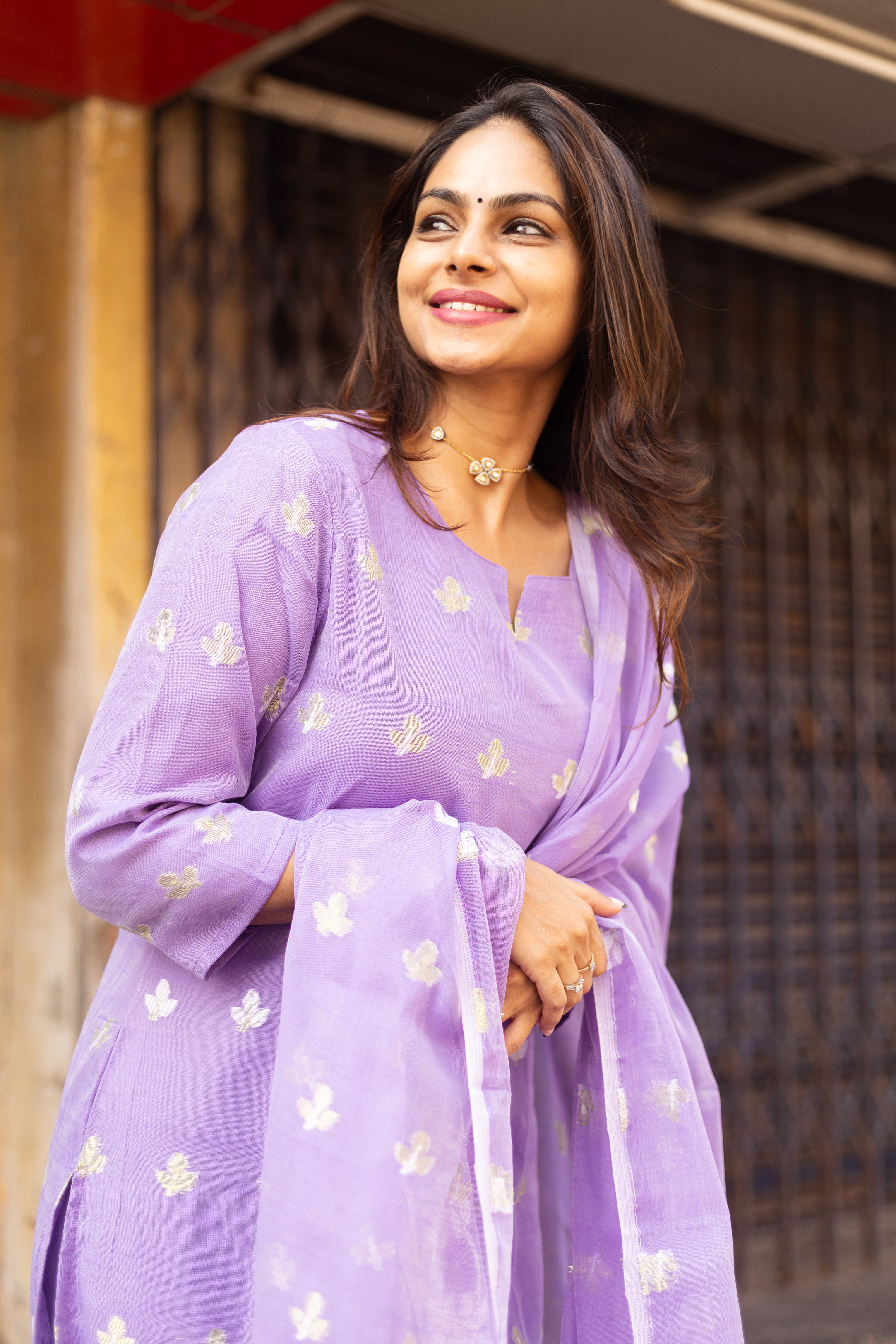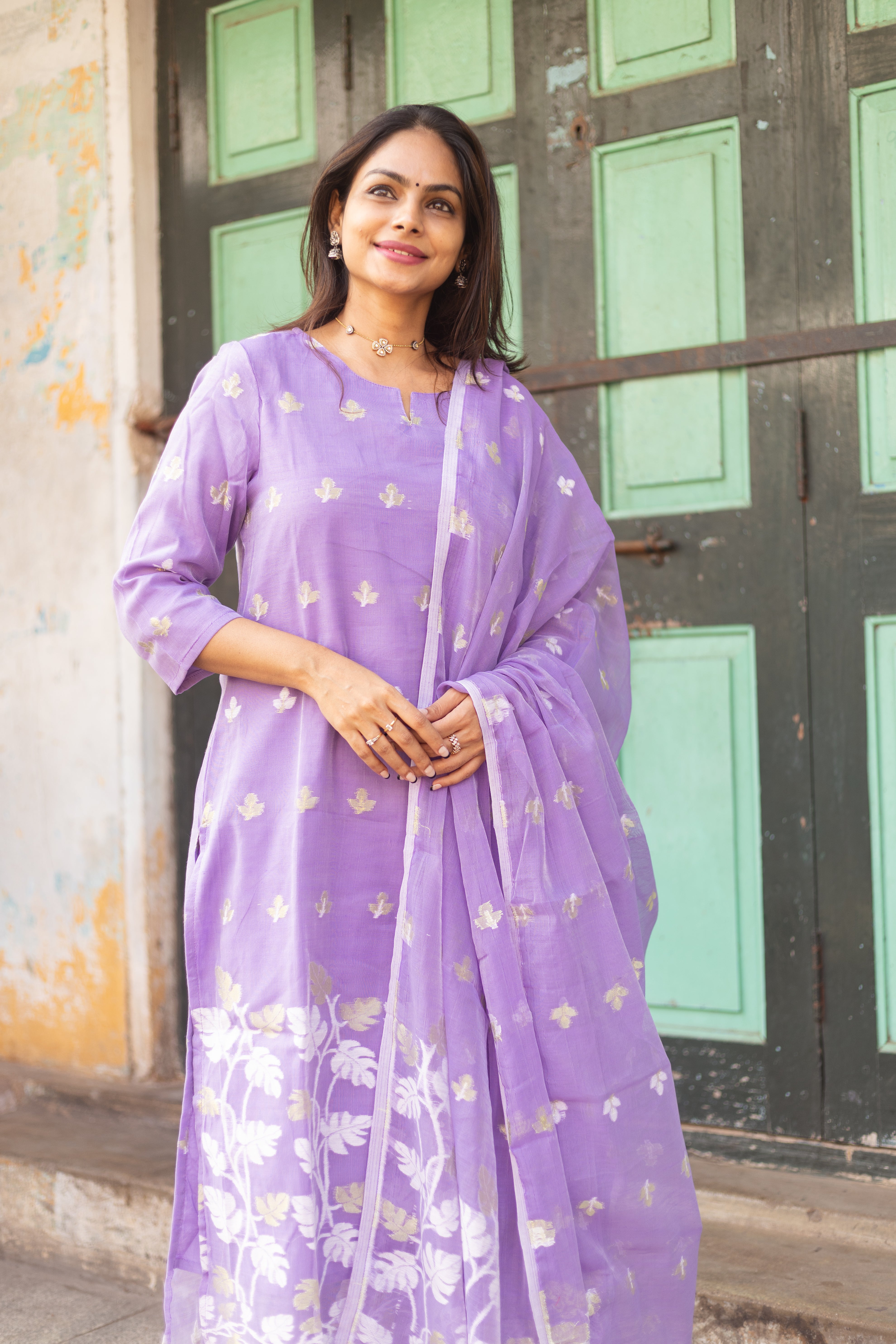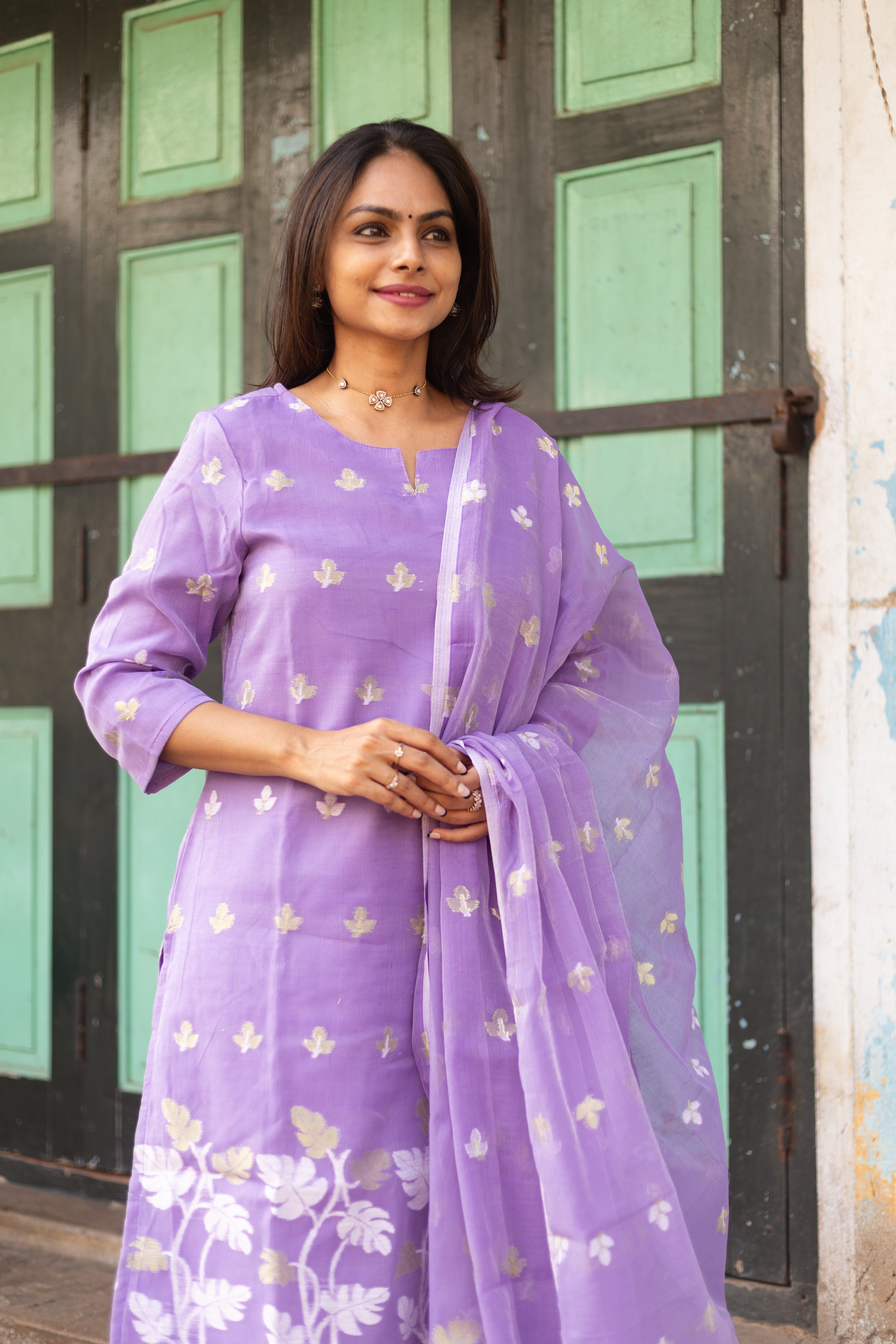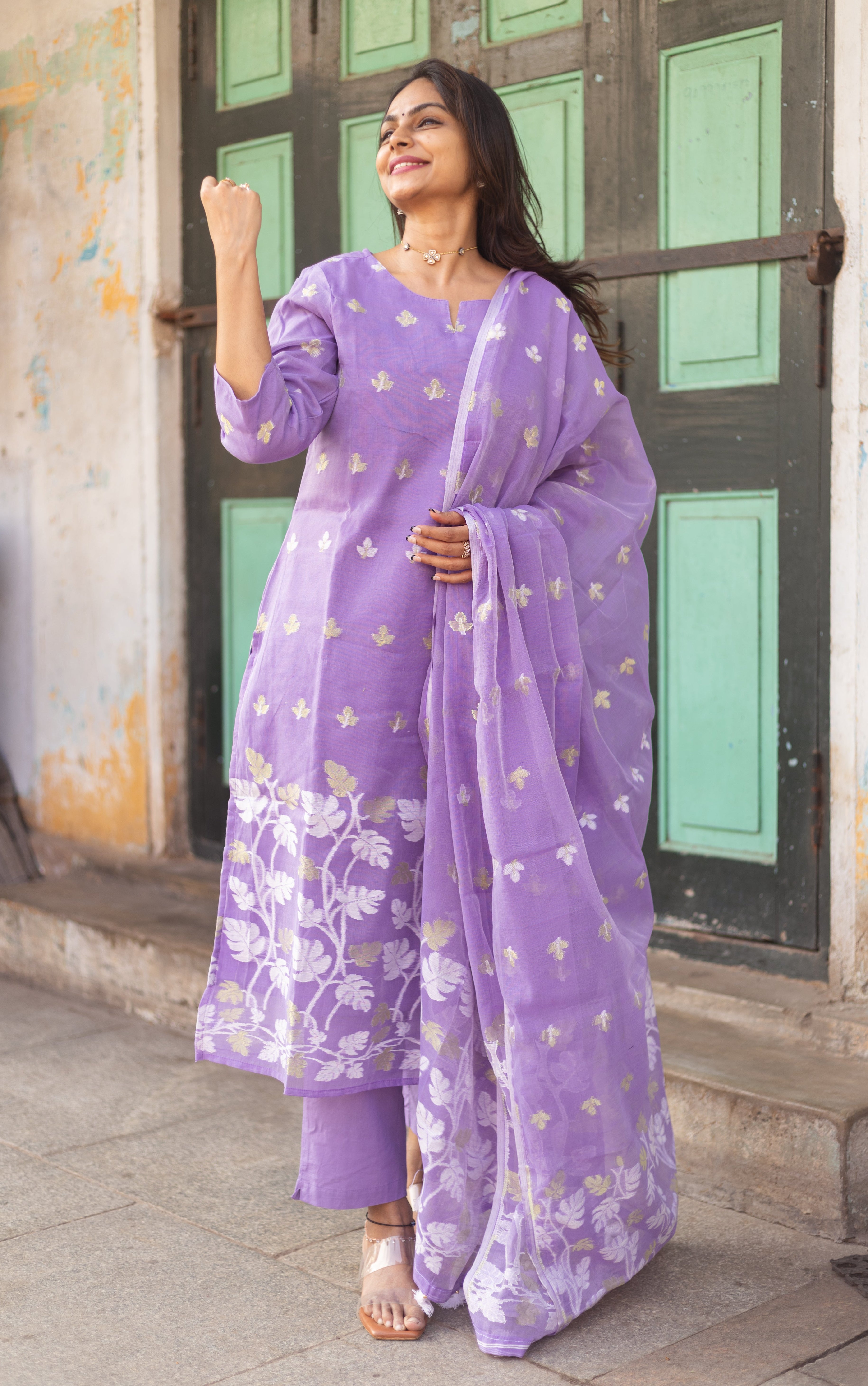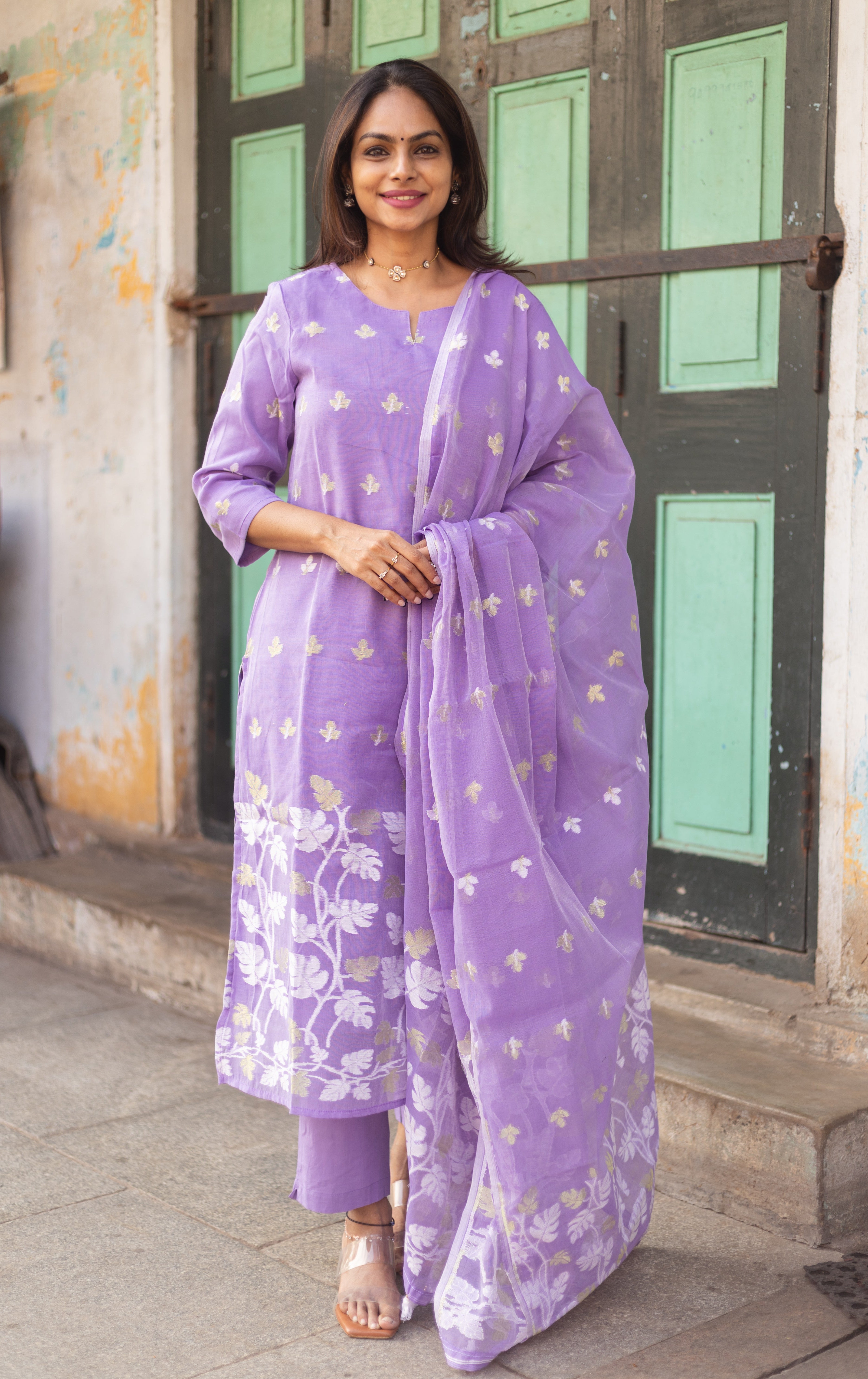 An elegant Lavender Jamdani suit adorned with vibrant handwoven motifs and artistic dupatta, perfect for casual flair and festive grace. 💫