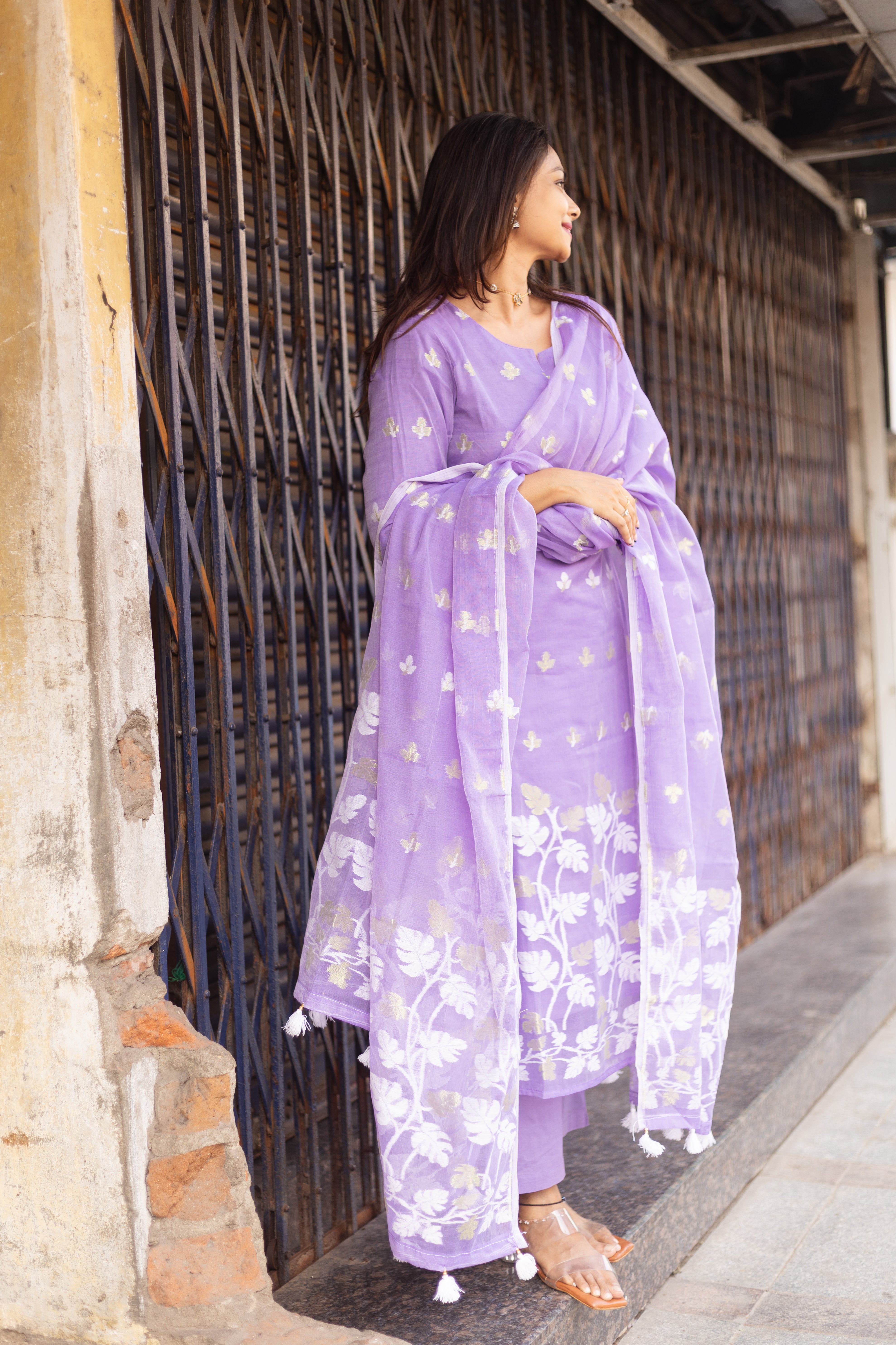Embrace the timeless beauty of handcrafted tradition with our Lavender Bloom Jamdani Charm suit. The kurta flaunts delicate thread motifs in white and silver that pop on a soft lilac canvas, giving it a balanced yet captivating appeal. The hemline features traditional woven floral panels that add a cultural spark. The highlight? A mesmerising Jamdani dupatta with intricate leaf pattern weaves and border tassels that whisper grace in every flutter. 🌿