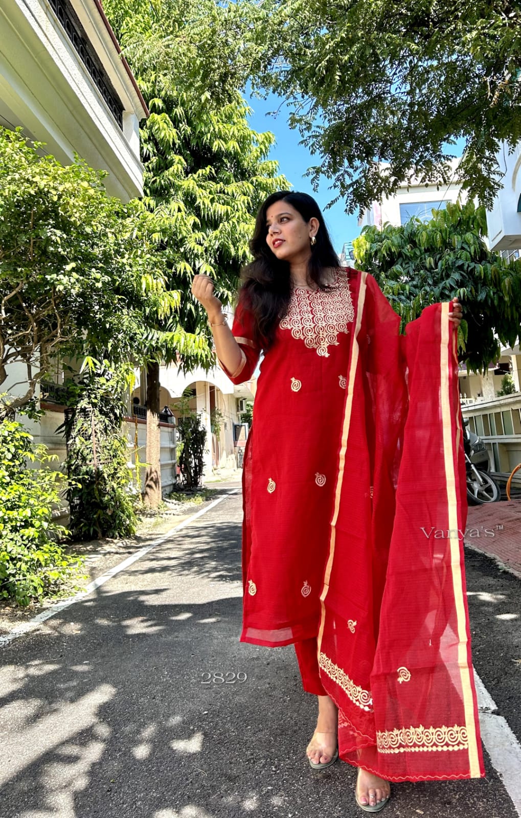 Explore this karwachauth and Diwali with this beautiful hot red kota Doria gotta paati zari work combination 3 pcs attire. Pure cotton based thread kota Doria kurta ( full cotton lining) with matching cotton pant Paired with kota Doria duppata