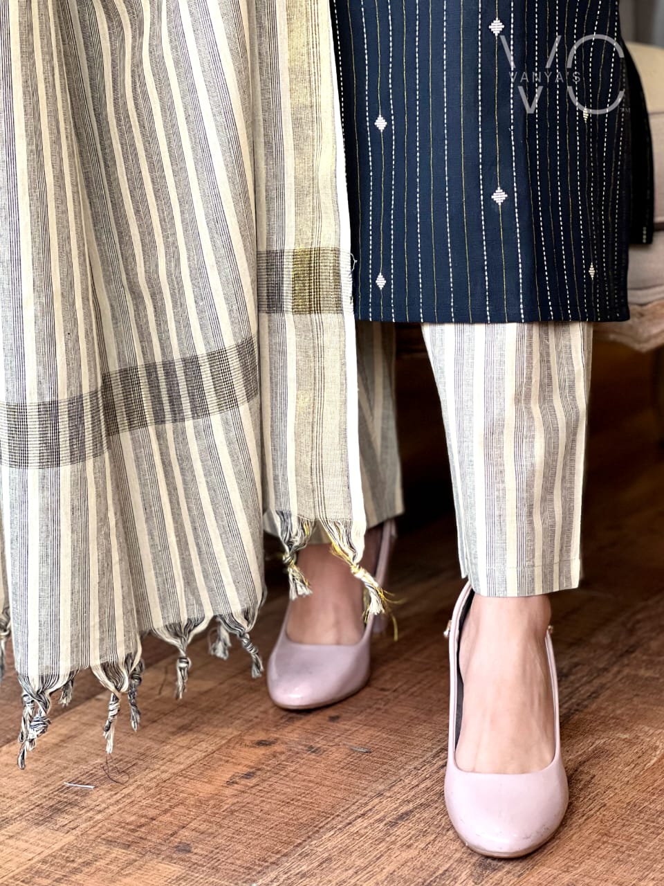 Add a dose of timeless elegance to your wardrobe with Noir Grace, a black cotton suit set that blends simplicity with refined craftsmanship. The kurta features vertical white pinstripes and delicate thread embroidery on the front panel, giving it a classic, elongated silhouette. The matching striped pants and contrast beige dupatta with tassel edges create a sophisticated contrast that adds depth and dimension to the entire ensemble. Whether itβs a festive day, casual outing, or an office event β this breathable, all-day-comfort suit is designed to make you stand out with ease. π«