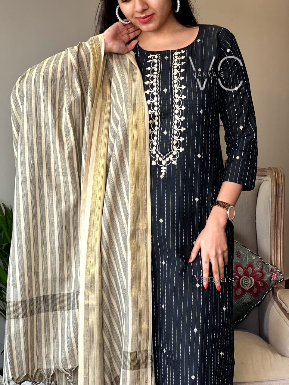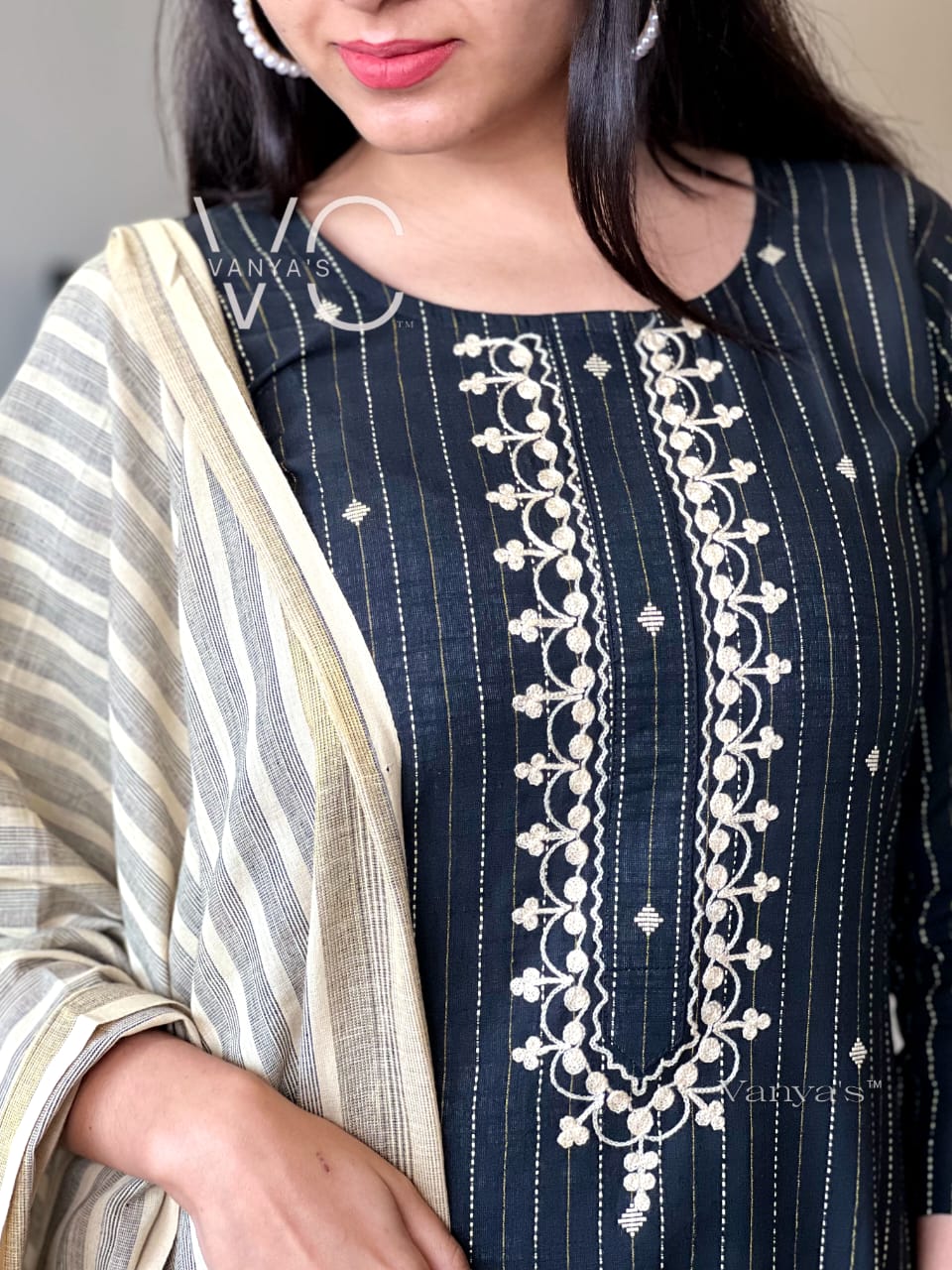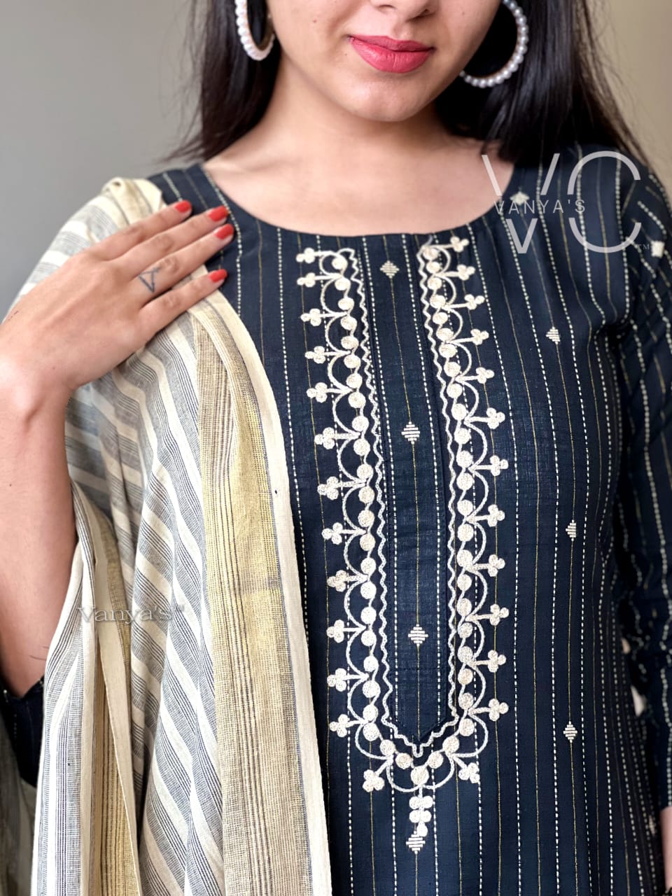 Elevate your ethnic wardrobe with this elegant black cotton suit set, detailed with vertical pinstripes, intricate white embroidery, and a graceful contrast dupatta. Perfect for both casual elegance and festive flair. πΈπ€