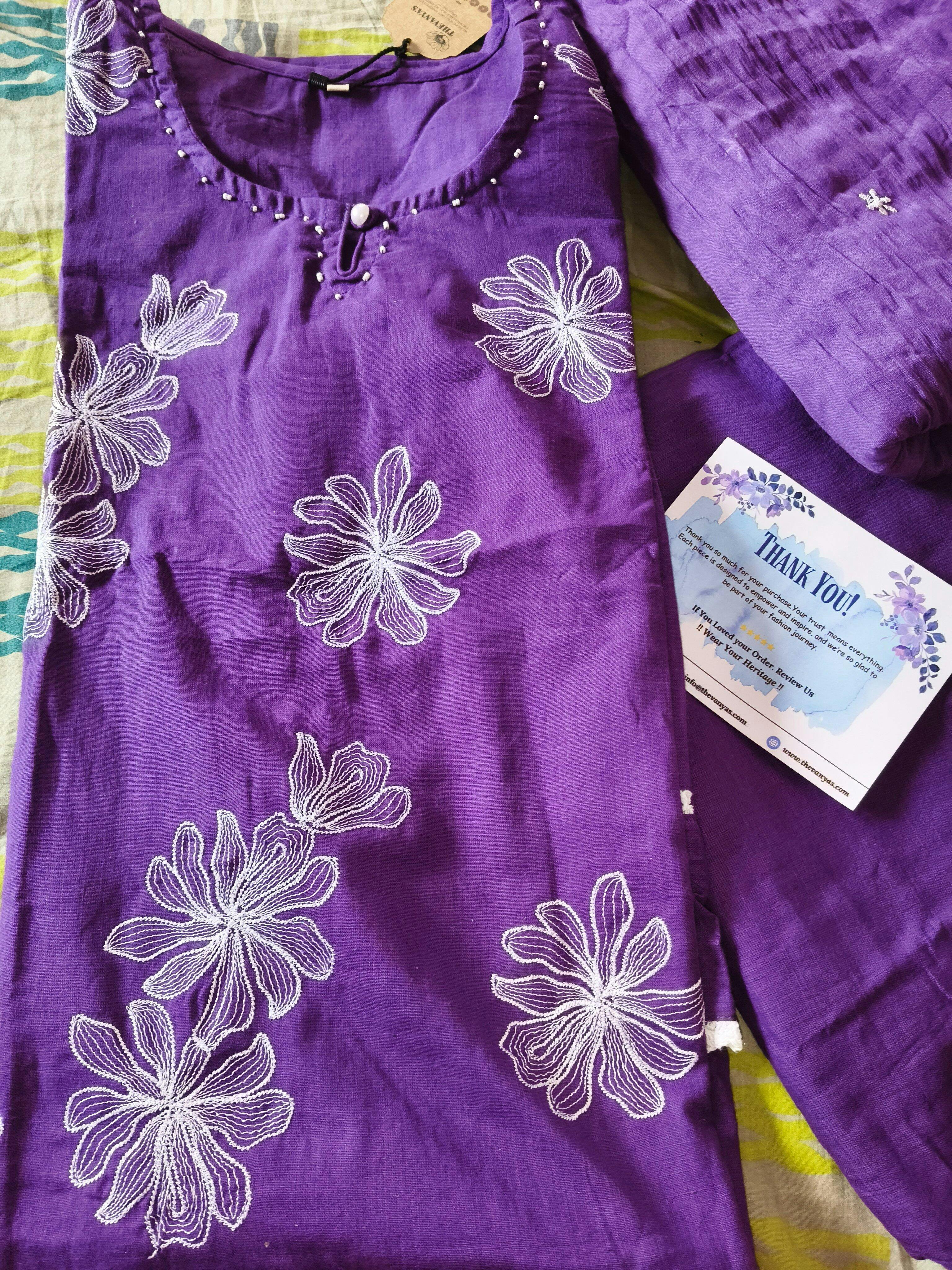 A breathable and breezy cotton suit set featuring delicate floral embroidery, crinkled dupatta, and vibrant summer-friendly hues — available in purple, rust, and lilac.