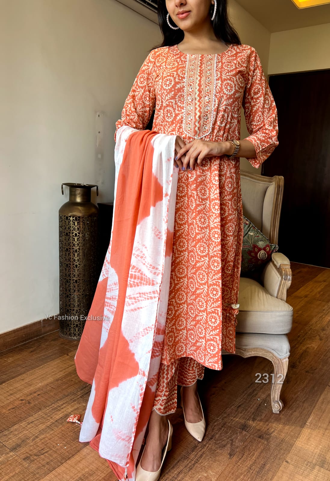 Step into vibrant grace with our "Rust Radiance" Cotton Suit Set β a charming ensemble designed to elevate your ethnic wardrobe. The kurta flaunts a captivating ethnic block print in soothing rust tones, delicately adorned with intricate thread & gota patti detailing at the front yoke. The standout feature is its unique zigzag-printed pants and the bold tie-dye dupatta that adds a splash of contemporary flair. Made with breathable cotton, this outfit ensures comfort without compromising on charm β ideal for all-day wear. π«