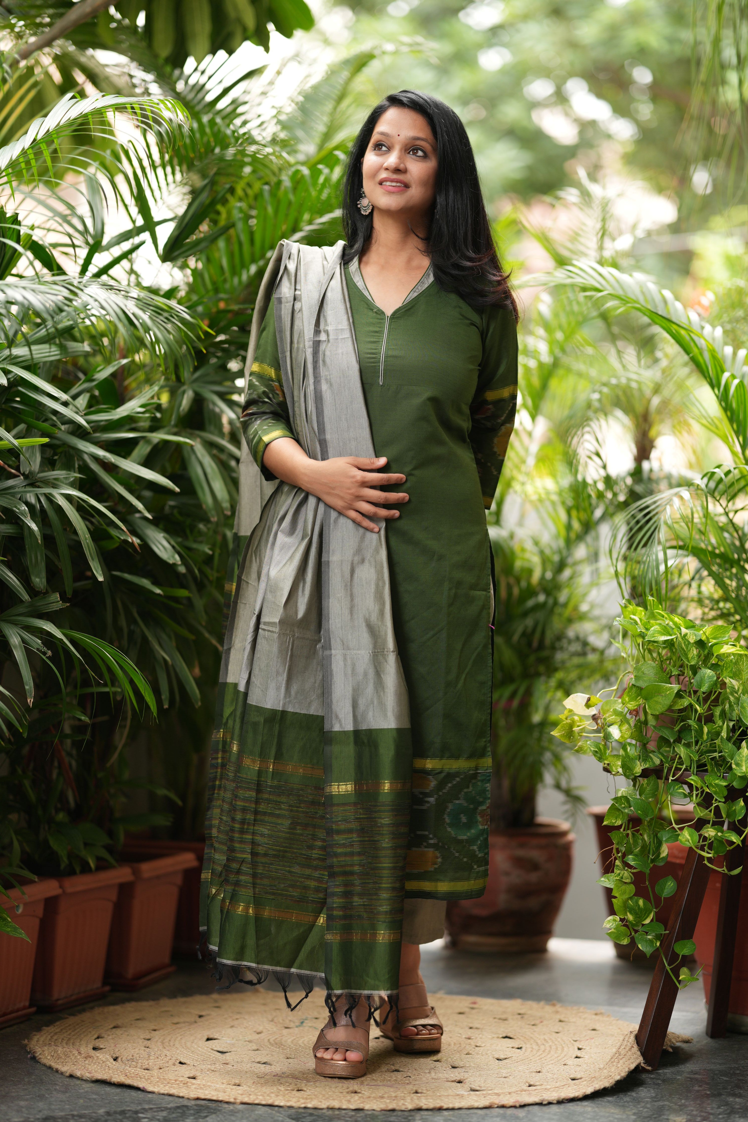 Step into subtle luxury with this olive green cotton-silk Pochampally suit set, exquisitely paired with a silver bordered dupatta. A graceful blend of traditional weave and modern finesse β made for the woman who loves understated glamour.