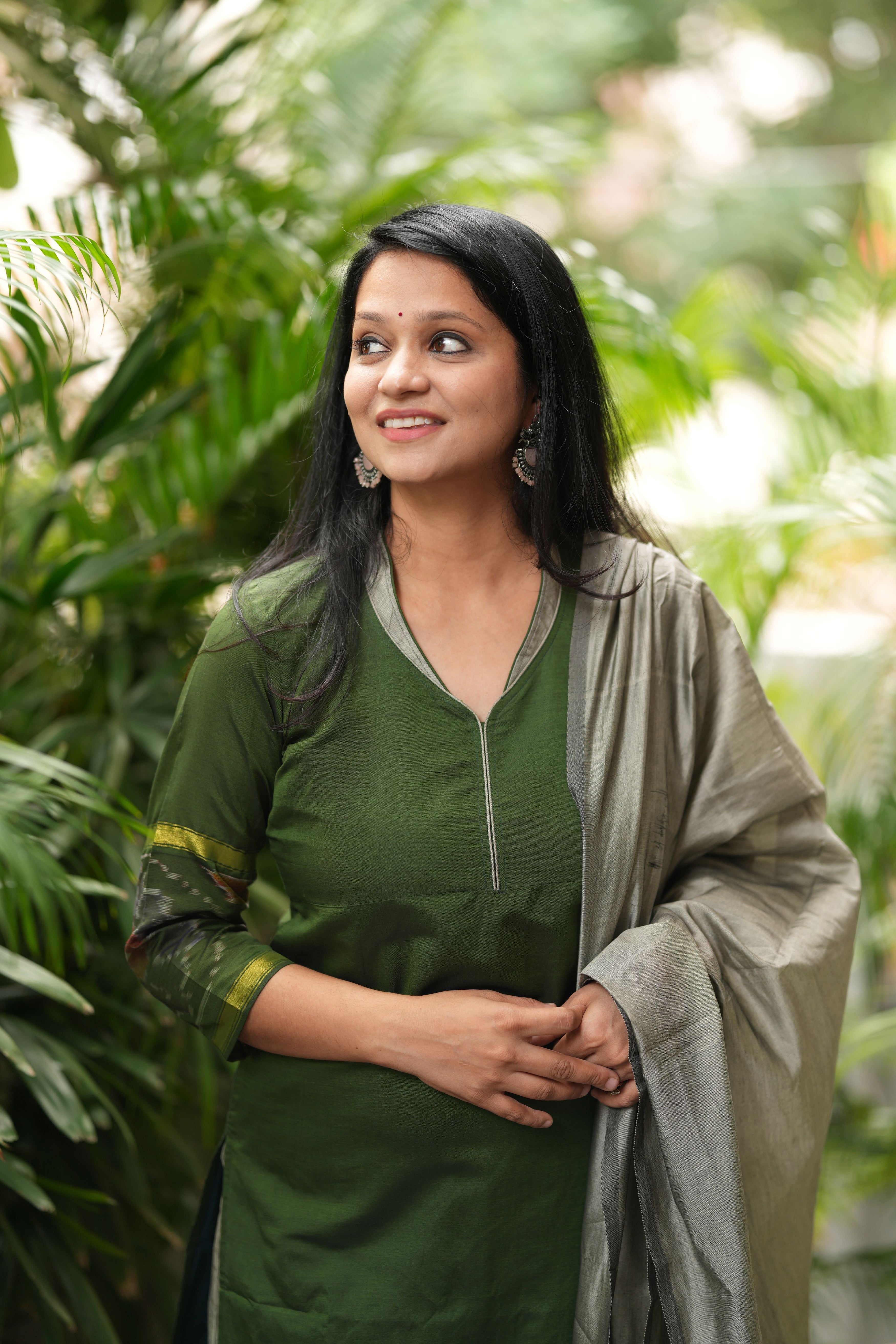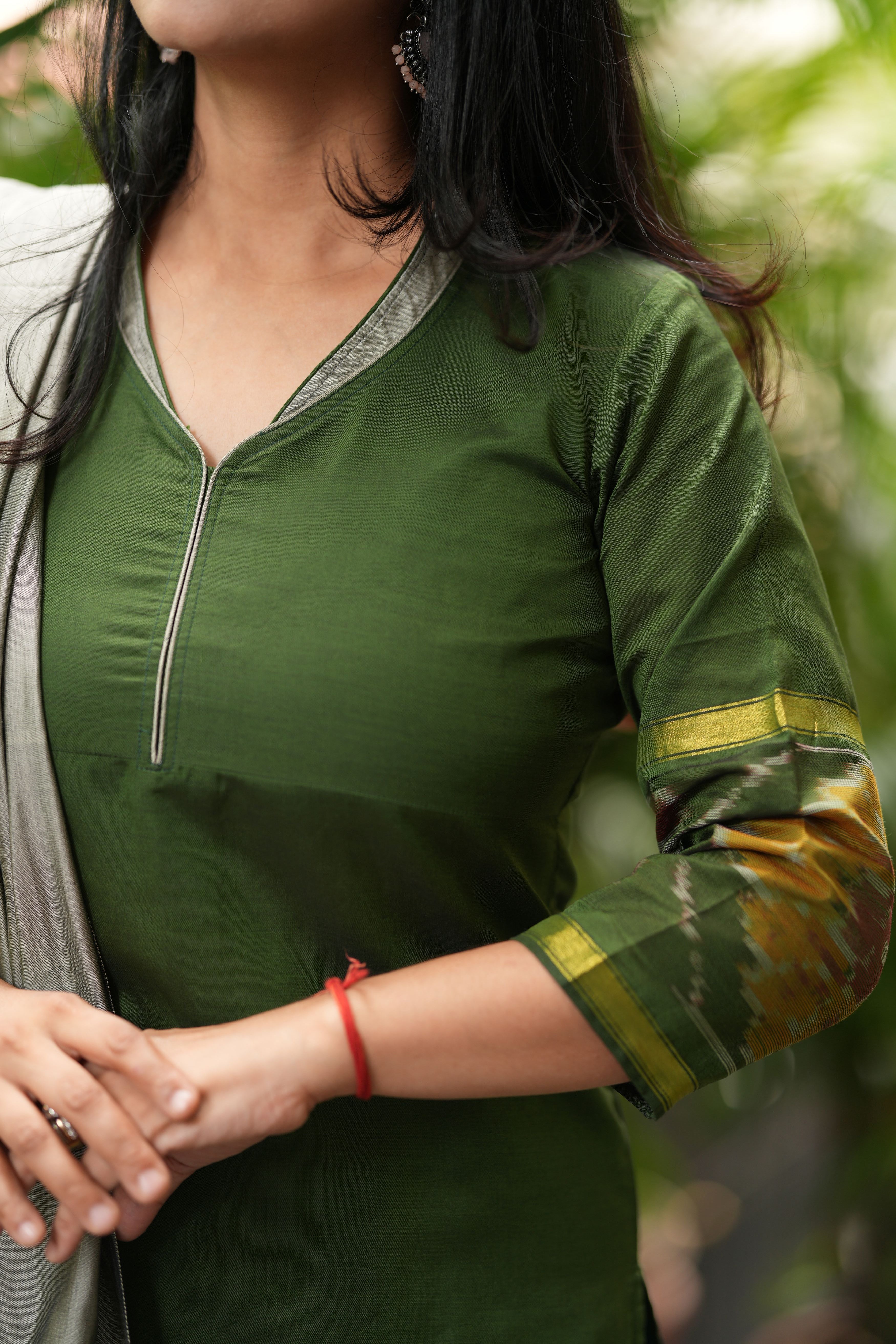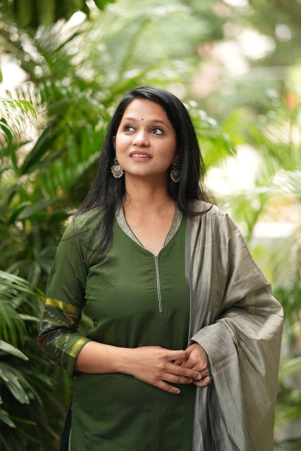 This Pochampally Silk Cotton Suit is a beautiful tribute to India's textile artistry. The elegant olive green kurta with woven sleeve motifs complements the silver silk dupatta with rich green pallu and zari borders. Lightweight and breathable, yet rich in aesthetic appeal β it's perfect for festive mornings and elegant evenings. A must-have for your Diwali wardrobe or ethnic celebrations πΏβ¨